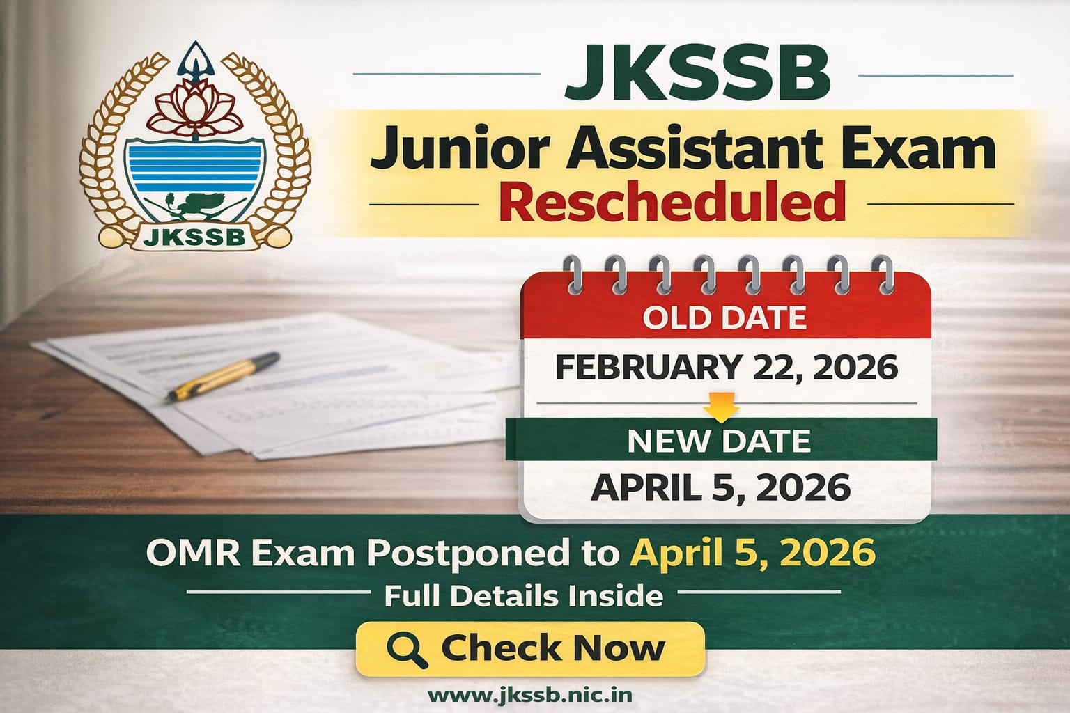 As per the official communication issued by JKSSB, the examination scheduled earlier on 22.02.2026 has now been postponed and will be conducted on 05.04.2026. This decision has been taken due to administrative reasons.